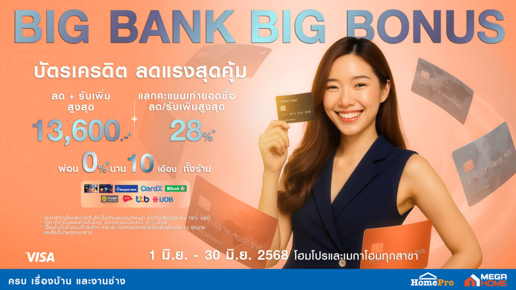 เอาใจสายแต่งบ้าน จ่ายชิลตลอดเดือนมิถุนานี้ #โฮมโปร ชวน #เมกาโฮม จับมือพาร์ตเนอร์บัตรเครดิตชั้นนำ จัดโปร “BIG BANK BIG BONUS” ชอปด้วยบัตรเครดิต ลดแรงสุดคุ้ม! ครบ! เรื่องบ้านและงานช่าง ชอปสะดวก จ่ายเบา ได้โบนัสเต็ม ๆ ให้ทั้งส่วนลด+รับเพิ่ม รวมสูงสุด 13,600 บาท !! พร้อมอัดความคุ้มแรง