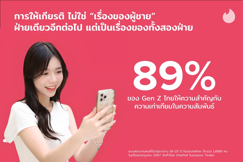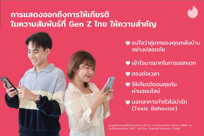 หลายคนอาจมีคำถามว่า การสร้างความสัมพันธ์ด้วยความสุภาพและให้เกียรติซึ่งกันและกัน ในยุคนี้ยังคงมีอยู่หรือไม่ จริงๆ ไม่ได้หายไปไหน แต่มีการปรับไปกับยุคสมัยผ่านการแสดงออกผ่านการรับรู้ และเข้าใจอารมณ์ความรู้สึก ทั้งของตัวเองและอีกฝ่าย จากผลสำรวจของ TinderⓇ 1 พบว่า Gen Z ไทย กำลังปรับเปลี่ยนวิธีการสร้างความสัมพันธ์แบบเดิมๆ อาทิ ไม่จำเป็นต้องแสดงความรักด้วยการจ่ายค่าอาหารแสนแพงเพื่อความประทับใจ แต่การออกเดททุกวันนี้ คนที่ทำคะแนนได้ดีคือคนที่ให้เกียรติซึ่งกันและกัน และพูดคุยกันอย่างเปิดเผย