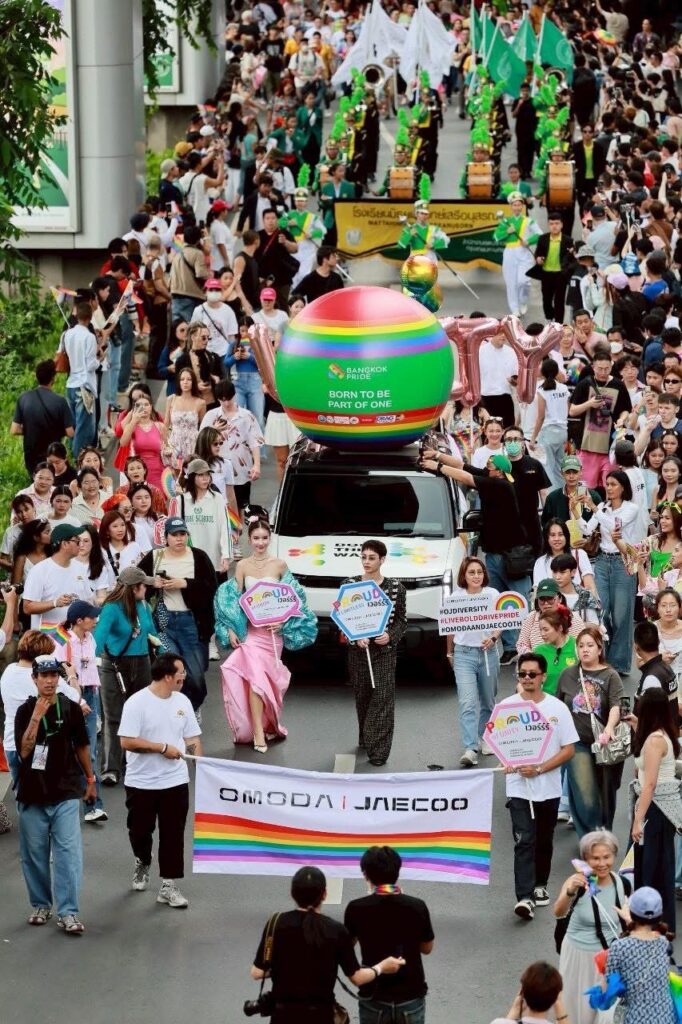 OMODA & JAECOO เข้าร่วมเป็นส่วนหนึ่งของขบวน Pride ด้วยแนวคิด “Show Proud: โชว์ตัวตนให้โลกต้องเหลียวมอง!” ผ่านขบวนรถไฟฟ้า 4 คันที่ตกแต่ง Wrap พิเศษในธีม Born This Way เป็นรถนำขบวน ซึ่งเคลื่อนตัวอย่างสง่างามในขบวนพาเหรด พร้อมบูธกิจกรรม ณ CentralWorld ที่เปิดโอกาสให้ทุกคนมาร่วมถ่ายรูป แชร์พลัง และแสดงตัวตนอย่างภาคภูมิใจ ท่ามกลางบรรยากาศอันคึกคักที่มีทั้ง นายกฯ แพทองธาร ชินวัตร นายกรัฐมนตรี และ นายชัชชาติ สิทธิพันธุ์ ผู้ว่าราชการกรุงเทพมหานคร ร่วมเฉลิมฉลองและเดินเคียงข้างขบวนพาเหรดอย่างเป็นทางการ เพื่อแสดงพลังสนับสนุนความหลากหลายทางเพศอย่างต่อเนื่อง