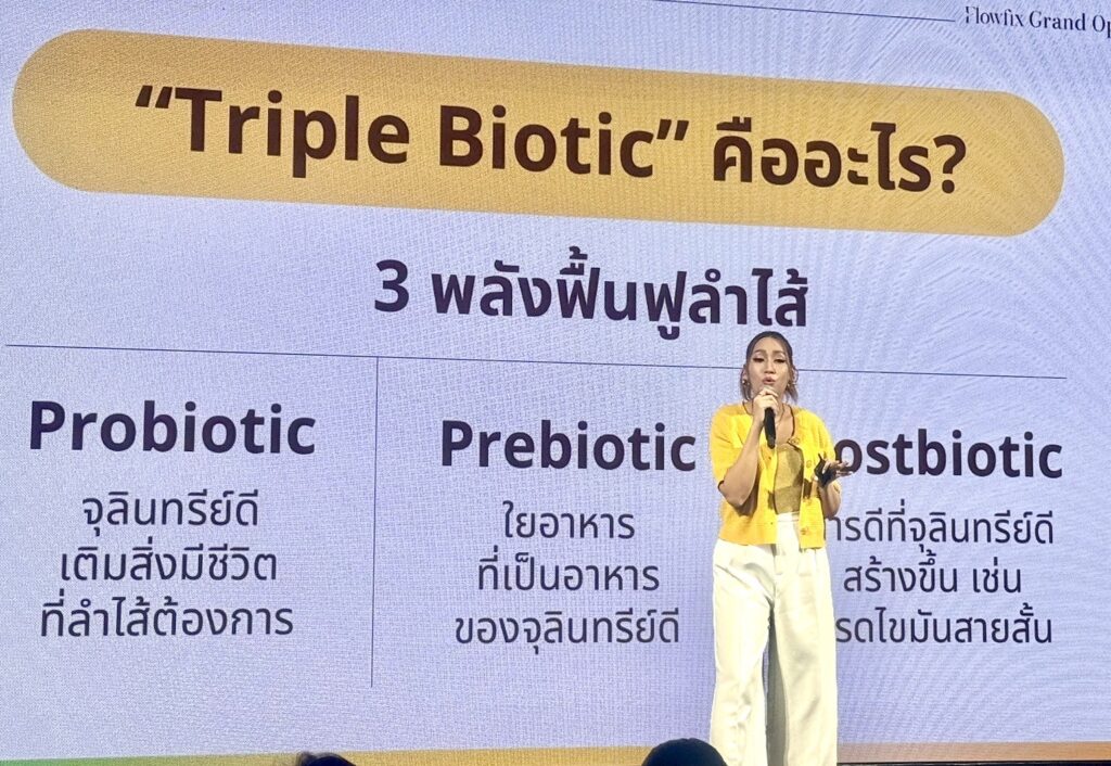 นางศิริญา เทพเจริญ ผู้บริหาร Genesenn (เกเนเซ่น) ที่ส่งทีมแพทย์เข้าร่วมพัฒนาสูตรทริปเปิ้ลไบโอติกจากไต้หวัน จนมาเป็น Flowfix เพื่อดูแลคนไทย กล่าวว่า “เราได้ทำงานด้านสุขภาพแบบองค์รวม ป้องกันก่อนแก้ไขมานานแล้ว และไบโอติกก็เป็นหนึ่งในตัวหลักที่เรานำมาใช้ในการดูแลสุขภาพ เพราะลำไส้คือสมองที่สองของร่างกาย การดูแลสุขภาพลำไส้เป็นสิ่งสำคัญต่อสุขภาพร่างกายและจิตใจ เนื่องจากลำไส้มีบทบาทสำคัญในการย่อยอาหาร ดูดซึมสารอาหาร สร้างระบบภูมิคุ้มกัน และส่งผลต่ออารมณ์และความรู้สึกคนเรา ถ้าลำไส้ดี ก็จะส่งผลดีต่อร่างกาย และ Flowfix คือทริปเปิ้ลไบโอติก ที่จะสามารถดูแลระบบลำไส้ได้อย่างครบวงจรค่ะ“ นางศิริญา กล่าว