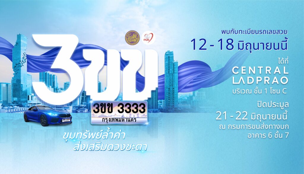 กรมการขนส่งทางบก เตรียมจัดงานแถลงข่าวประชาสัมพันธ์การประมูลหมายเลขทะเบียนรถใน หมวดอักษรพิเศษ “3ขข” ในระหว่างวันที่ 12-18 มิถุนายน 2568 ณ เซ็นทรัลลาดพร้าว ชั้น 1 โซน C เพื่อประชาสัมพันธ์การประมูลหมายหมายเลขทะเบียนรถในหมวดอักษรพิเศษ 3 ขข โดยกรมการขนส่งทางบก มีกำหนดการประมูลทะเบียนรถเลขสวย หมวดอักษรพิเศษ “3ขข” ในวันที่ 21 – 22 มิถุนายน 2568 ภายใต้คอนเซปต์ “ขุมทรัพย์ล้ำค่า ส่งเสริมดวงชะตา” เลข 3 เปรียบเสมือน มีเทพเจ้าแห่งโชคลาภ ฮก ลก ซิ่ว ทั้งสามองค์ คุ้มครอง ช่วยเสริมดวงชะตา มีโชคลาภ, ขข เมื่อมีสิ่งศักดิ์คุ้มครอง ข แรกจะเป็น การขอพรหรือหวังสิ่งใดสมหวัง ก็สำเร็จ อีก ข ก็เป็นตะขอคอยเกี่ยวทรัพย์ ดังนั้น 3ขข ไม่ใช่แค่ป้ายทะเบียน แต่คือ…ขุมทรัพย์แห่งพลังชีวิต ผู้ที่ได้ครอบครองคือผู้ที่ได้พลังแห่งโชคลาภและความสำเร็จ โดยรายได้จากการประมูลทั้งหมดจะนำเข้ากองทุนเพื่อความปลอดภัยในการใช้รถใช้ถนน โดยมีวัตถุประสงค์เพื่อเป็นทุนสนับสนุน และส่งเสริมด้านความปลอดภัยในการใช้รถใช้ถนน จัดทำโครงการรณรงค์ป้องกันและลดอุบัติเหตุทางถนน สนับสนุนค่าใช้จ่ายการศึกษาวิจัยด้านความปลอดภัยทางถนน และให้ความช่วยเหลืออุปกรณ์ผู้พิการที่ประสบภัยอันเกิดจากการใช้รถใช้ถนน