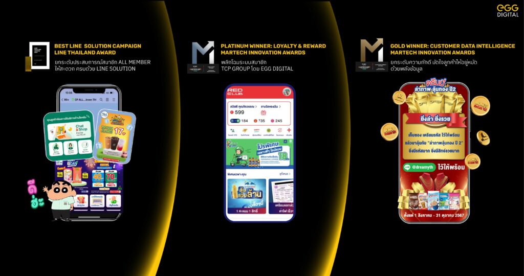 คุณรัฐธีร์ เจริญรัตน์วรกุล ผู้จัดการทั่วไป ธุรกิจ MarTech Solution บริษัท เอ้ก ดิจิทัล จำกัด กล่าวว่า “การคว้า 7 รางวัลใหญ่จาก LINE Thailand Awards 2024 และ MarTech Innovation Awards 2025 เป็นบทพิสูจน์ความสำเร็จและสะท้อนให้เห็นถึงความเป็นผู้นำ MarTech Solution ที่โซลูชันด้านการตลาดและการสื่อสารแบบครบวงจรในที่เดียว (All-in-One Solutions) ตั้งแต่การเก็บและบริหารจัดการข้อมูลลูกค้า (CRM & CDP) การวิเคราะห์ข้อมูลเชิงลึกเพื่อต่อยอดในมุมธุรกิจ ไปจนถึงการให้คำปรึกษา พร้อมการวางกลยุทธ์การตลาดที่ตอบโจทย์คู่ค้าได้อย่างตรงจุด สร้างการสื่อสารที่มีประสิทธิภาพในทุก Touchpoint และสร้างประสบการณ์ที่เฉพาะบุคคลแบบ Dynamic Personalization ให้กับผู้บริโภค โดยความสำเร็จในครั้งนี้เกิดจากพลังของทีมงานและพาร์ทเนอร์ที่มีวิสัยทัศน์ที่ตรงกัน โดยเราผสานจุดแข็งทุกมิติให้ทำงานร่วมกัน ไม่ว่าจะเป็น ด้านดาต้า เทคโนโลยีขั้นสูงทั้ง AI, Machine Learning, EGG ONE Platform แพลตฟอร์มการตลาดที่รวมเครื่องมือและข้อมูลสำคัญไว้ในที่เดียว รวมไปถึงความคิดสร้างสรรค์และความเข้าใจเชิงลึกของทีมผู้เชี่ยวชาญมากประสบการณ์ เพื่อสร้างสรรค์โซลูชันที่มีประสิทธิภาพ โดนใจผู้บริโภค และสร้างผลลัพธ์ทางธุรกิจได้จริง”