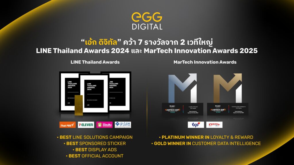 เอ้ก ดิจิทัล (EGG Digital) ผู้นำธุรกิจด้านวิเคราะห์ข้อมูลขนาดใหญ่ ให้บริการสื่อโฆษณาครบวงจรและการตลาดดิจิทัลที่ขับเคลื่อนด้วยพลัง AI อัจฉริยะ ประกาศความสำเร็จครั้งใหญ่ กวาด 7 รางวัลจาก 2 เวทีระดับประเทศ ได้แก่ 5 รางวัลจาก LINE Thailand Awards 2024 และ 2 รางวัลจาก MarTech Innovation Awards 2025 ตอกย้ำความเป็นผู้นำด้าน MarTech ที่มุ่งยกระดับเกมการตลาดสู่ยุคอัจฉริยะ (Cognitive Marketing) ด้วยการผสานพลัง AI, ดาต้า, EGG ONE Platform และทีมผู้เชี่ยวชาญมากประสบการณ์ เพื่อสร้างประสบการณ์ที่เหนือระดับให้กับผู้บริโภค และส่งมอบผลลัพธ์ทางธุรกิจที่วัดผลได้ พร้อมช่วยขับเคลื่อนแบรนด์คู่ค้าให้เติบโตอย่างมีประสิทธิภาพในทุกมิติ