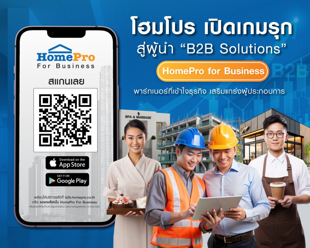 โฮมโปร เปิดตัวแพลตฟอร์มใหม่ “HomePro for Business” รุกตลาดธุรกิจ B2B ครอบคลุมกว่า 11 กลุ่มธุรกิจ ภายใต้แนวคิด “มากกว่าร้านค้า คือ พาร์ทเนอร์ที่ร่วมขับเคลื่อนความสำเร็จของธุรกิจ” มุ่งส่งมอบโซลูชันครบวงจร ด้วยประสบการณ์ในธุรกิจค้าปลีกสินค้าและบริการเรื่องบ้านมาเกือบ 30 ปี ด้วยสินค้ากว่า 75,000 SKU และบริการอย่างมืออาชีพ พร้อมสาขาและพาร์ตเนอร์ที่ครอบคลุมทั่วประเทศ ที่เข้าถึงง่าย สะดวก ส่งไว และให้สิทธิประโยชน์มากมาย ช่วยให้ผู้ประกอบการบริหารต้นทุนสินค้าได้อย่างมีประสิทธิภาพ และเติบโตอย่างมั่นคง