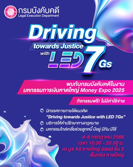 กรมบังคับคดี กระทรวงยุติธรรม ขอเชิญชวนพี่น้องชาวใต้ร่วมงานมหกรรมการเงินหาดใหญ่ MONEY EXPO 2025 ณ หาดใหญ่ฮอลล์ ชั้น 5 ศูนย์การค้าเซ็นทรัลเฟรสติวัล หาดใหญ่ ภายใต้แนวคิด “บังคับคดีเชิงรุก สร้างสุขแก่ประชา นำพาความยุติธรรม” หรือ “Driving towards Justice with LED 7Gsระหว่างวันที่ 4 – 6 กรกฎาคม 2568 บูธหมายเลข A9 หาดใหญ่ฮอลล์ ชั้น 5 ศูนย์การค้าเซ็นทรัลเฟรสติวัล หาดใหญ่