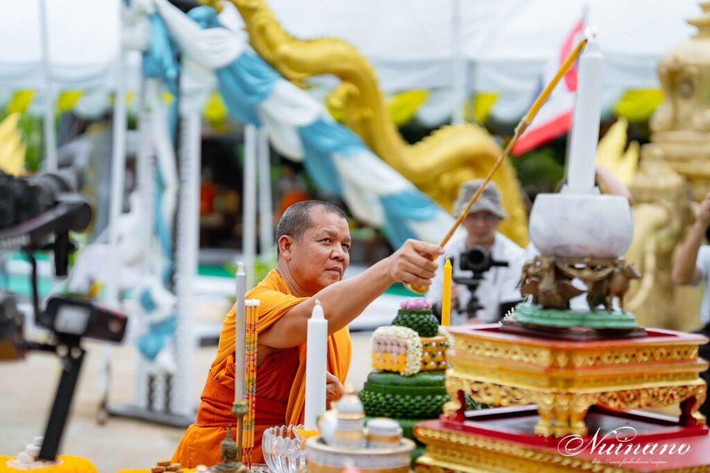 ”วันนี้มาหล่อที่โรงหล่อพระฤทธิ์สมบูรณ์ สมุทรสาคร และได้เชิญชวนผู้มีจิตศรัทธามาร่วมบุญ เป็นวาระใหญ่มาก เพราะเป็นเศียรหลวงปู่ เป็นสิ่งที่อยู่สูงสุด เฉพาะขนาดจากไหล่ถึงปลายเศียรประมาณ 5 เมตร โดยงบประมาณจัดสร้างรวมทั้งองค์น่าจะ 40 ล้าน โดยการจัดสร้างครั้งนี้ เราเริ่มจากเงินศูนย์บาท เป็นการบอกบุญปากต่อปาก และก่อนหน้านี้เราได้หล่อองค์เท่าหลวงปู่สุข ปีที่สองหล่อหัวใจของหลวงปู่ ปีที่สามหล่อกระหม่อม จนวาระที่สี่หล่อเศียร์หลวงปู่“