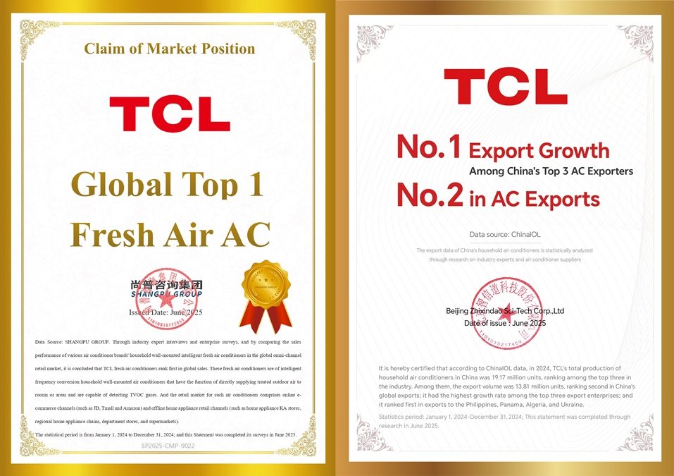 TCL ได้สร้างมาตรฐานใหม่ให้กับอุตสาหกรรมเครื่องปรับอากาศ Fresh Air อย่างต่อเนื่อง จากการประกาศ Global Fresh Air Strategy ในปี 2021 และการเปิดตัวนวัตกรรม FreshIN 3.0 และ FreshIN C7 ที่มาพร้อมเทคโนโลยีล้ำสมัย อาทิ การควบคุมด้วยเสียง AI, การประหยัดพลังงานด้วย AI สูงสุดถึง 37% การเติมอากาศบริสุทธิ์อย่างต่อเนื่อง และระบบลดเสียงรบกวน ซึ่งทำให้ FreshIN 3.0 ได้รับรางวัล “Smart Fresh Air Technology Innovation Award” ในงาน CES 2025 ตอกย้ำความเป็นผู้นำด้านเทคโนโลยีที่ผสานกับการขยายตลาดทั่วโลก ส่งผลให้บริษัทมียอดขายต่างประเทศคิดเป็น 65% ของยอดขายรวม และครองอันดับ 1 ยอดส่งออกเครื่องปรับอากาศในหลายประเทศ อาทิ ฟิลิปปินส์ ปานามา แอลจีเรีย และยูเครน