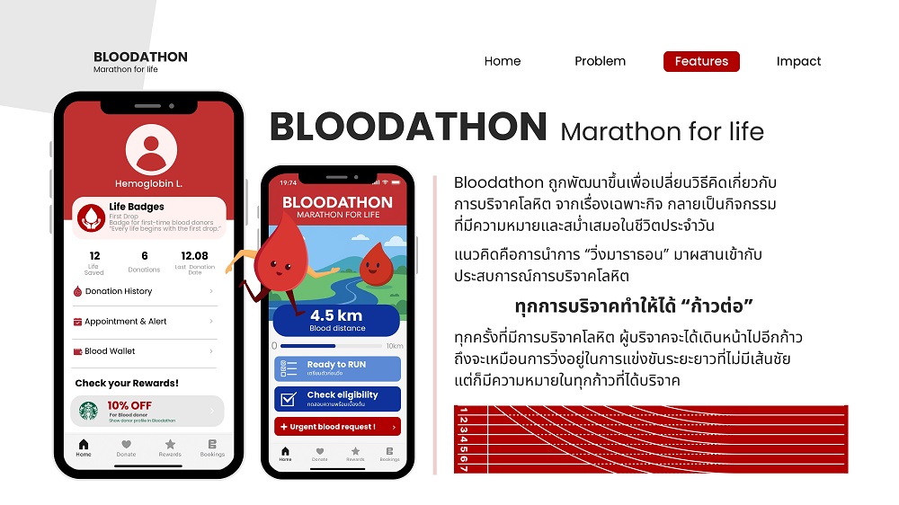 นางสาวสุมิตรา ศิลาโรจน์ นิสิตชั้นปีที่ 2 คณะพาณิชยศาสตร์และการบัญชี จุฬาลงกรณ์มหาวิทยาลัย ตัวแทนจากทีม BLOODATHON ที่ได้รับรางวัลชนะเลิศ เล่าถึงแนวคิดของผลงานที่ได้รับรางวัลในครั้งนี้ว่า “จากโจทย์ที่ต้องนำเสนอไอเดีย ในการใช้เทคโนโลยีมาช่วยกระตุ้น ดึงดูด รวมถึงอำนวยความสะดวกให้เยาวชนไทยมาบริจาคโลหิตมากขึ้น เพื่อบรรเทา Pain Point เกี่ยวกับการบริจาคโลหิตของคนรุ่นใหม่ การเปลี่ยนมุมมองหรือการรับรู้ของคนรุ่นใหม่ที่มีต่อการบริจาคโลหิต จากเรื่องเฉพาะกิจให้กลายเป็นกิจกรรมที่มีความหมายและสม่ำเสมอในชีวิตประจำวัน คือ จุดมุ่งหมายที่เราอยากให้เกิดขึ้น จึงเป็นที่มาของแนวคิดในการออกแบบแอปพลิเคชัน ‘BLOODATHON Marathon for life’ โดยนำการ ‘วิ่งมาราธอน’ มาผสานเข้ากับประสบการณ์การบริจาคโลหิต ซึ่งเป็นแกนหลักในการออกแบบฟีเจอร์ต่าง ๆ ในแอปฯ เช่น ฟีเจอร์ Blood Kilometers ระบบสะสมระยะทางจากการบริจาคโลหิตเพื่อปลดล็อกรางวัลต่าง ๆ ทำให้การบริจาคโลหิตมีเป้าหมาย ช่วยเพิ่มแรงจูงใจและดึงดูดให้เยาวชน ที่เป็นกลุ่มเป้าหมายหลักมาบริจาคโลหิตอย่างต่อเนื่อง รวมถึงฟีเจอร์อื่น ๆ ที่จะช่วยอำนวยความสะดวกในการมาบริจาคโลหิต เช่น ฟีเจอร์ Ready to Run ระบบ Check-list เตรียมความพร้อมเบื้องต้นก่อนบริจาคโลหิต เพื่อให้ผู้ที่ต้องการจะบริจาคโลหิตสามารถประเมินความพร้อมของร่างกายได้ด้วยตนเองก่อนไปบริจาค และแจ้งเตือนให้กลับมาบริจาคอย่างต่อเนื่องทุก ๆ 90 วัน ซึ่งเป็นระยะเวลาที่สภากาชาดไทยกำหนดไว้ เป็นต้น