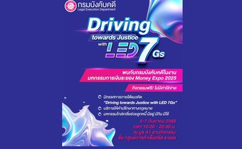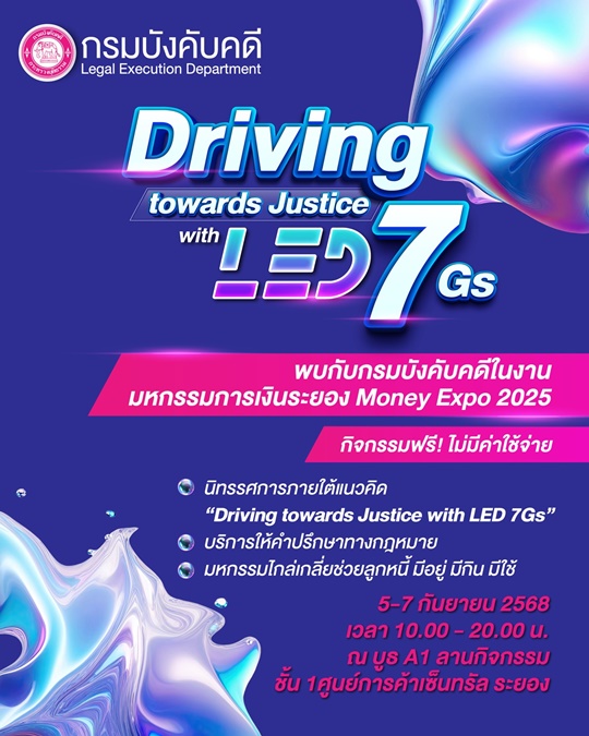 กรมบังคับคดี กระทรวงยุติธรรม เชิญชวนประชาชนร่วมงาน มหกรรมการเงินระยอง ครั้งที่ 7 Money Expo 2025 ระหว่างวันที่ 5 – 7 กันยายน 2568 ณ บูธ A1 ลานกิจกรรม ชั้น 1ศูนย์การค้าเซ็นทรัล ระยอง พบกับบูธ กรมบังคับคดี ภายใต้แนวคิด “Driving towards Justice with LED 7Gs” ที่มุ่งให้ความรู้และบริการด้านกฎหมายอย่างครอบคลุม