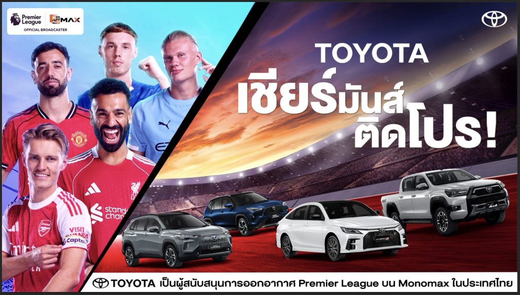 บริษัท โตโยต้า มอเตอร์ ประเทศไทย จำกัด ร่วมมือกับ บริษัท โมโนสตรีมมิ่ง จำกัด หรือ Monomax แพลตฟอร์มหลักในการถ่ายทอดสดพรีเมียร์ลีก และ บริษัท จัสมิน อินเตอร์เนชั่นแนล จำกัด (มหาชน) หรือ JAS ผู้ถือลิขสิทธิ์การถ่ายทอดสดฟุตบอลพรีเมียร์ลีก และ เอมิเรตส์ เอฟเอ คัพ อย่างเต็มรูปแบบในประเทศไทย ผนึกกำลังขับเคลื่อนประสบการณ์การรับชมฟุตบอลของชาวไทยไปสู่อีกระดับ โดยการเป็นผู้สนับสนุนการออกอากาศ Premier League บน Monomax อย่างเป็นทางการ พร้อมเปิดตัวแคมเปญใหญ่ ‘เชียร์มันส์ ติดโปร’ มอบสิทธิพิเศษมูลค่ากว่า 10 ล้านบาทตลอดฤดูกาล 2025/26