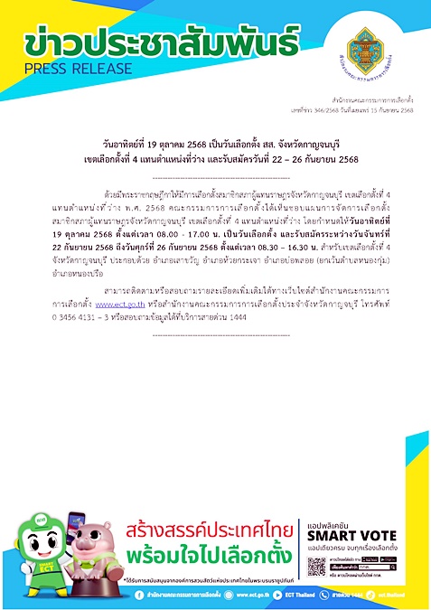 วันอาทิตย์ที่ 19 ตุลาคม 2568 เป็นวันเลือกตั้ง สส. จังหวัดกาญจนบุรีเขตเลือกตั้งที่ 4 แทนตำแหน่งที่ว่าง และรับสมัครวันที่ 22 – 26 กันยายน 2568