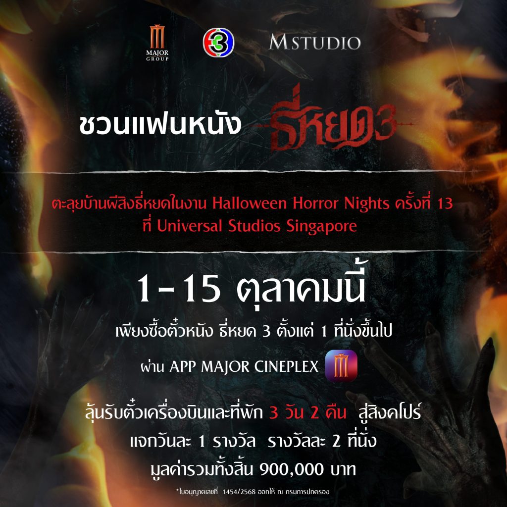 “M STUDIO” ชวนแฟนหนังร่วมสัมผัสความหลอนขั้นสุดกับภาพยนตร์ “ธี่หยด 3” พร้อมกิจกรรมสุดพิเศษ ที่จะพาแฟน ๆ ลุ้นบินลัดฟ้าสู่สิงคโปร์ ตะลุยบ้านผีสิง “ธี่หยด” ในงาน Halloween Horror Nights ครั้งที่ 13 ณ Universal Studios Singapore