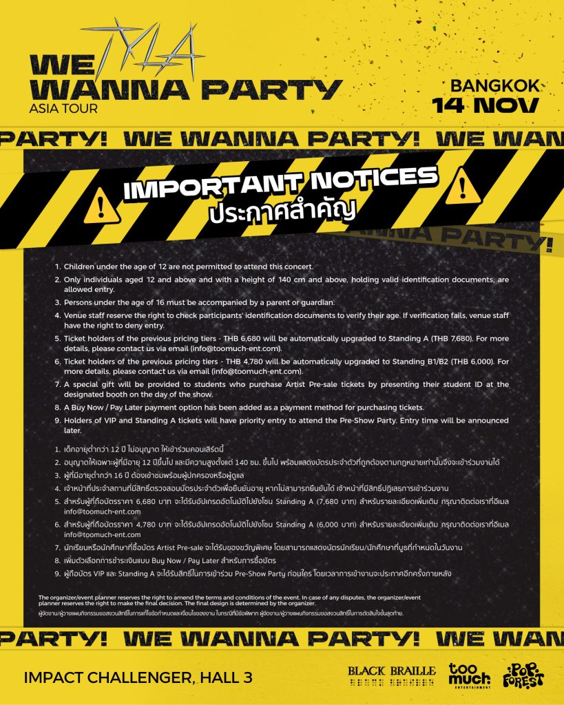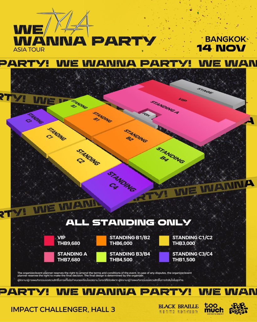 เมื่อแฟน ๆ ขอมา เราจัดให้! กับการเพิ่มโซนใหม่พร้อมราคาปรับใหม่ให้โดนใจ เพื่อโชว์นี้ที่กรุงเทพฯ โดยเฉพาะ เพื่อมอบความคุ้มค่าให้แฟน ๆ ของเรา เตรียมตัว เตรียมใจ และปล่อยจอยไปกับปาร์ตี้ TYLA WE WANNA PARTY ASIA TOUR in Bangkok ได้แล้วในวันที่ 14 พฤศจิกายน ณ Impact Challenger Hall 3 โดยบัตรราคา 9,680 บาท / 7680 บาท / 6,000 บาท / 4,500 บาท / 3,000 บาท / 1,500 บาท สามารถซื้อได้แล้วทาง Megatix ตั้งแต่วันที่ 17 กันยายนเป็นต้นไป