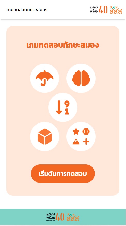 หนึ่งในเครื่องมือที่ถูกออกแบบขึ้นเพื่อช่วยให้ประชาชนเข้าใจสุขภาพสมองของตัวเองก็คือ “เกมทดสอบทักษะสมอง” ที่พัฒนาโดยสำนักงานกองทุนสนับสนุนการสร้างเสริมสุขภาพ (สสส.) ร่วมกับภาคีเครือข่ายด้านสุขภาพสมอง ซึ่งมีเป้าหมายร่วมกันในการส่งเสริมให้คนไทย “สูงวัยอย่างมีคุณภาพ” ผ่านแคมเปญ “สูงวัยให้พร้อม ต้องเตรียมก่อน 40” จึงได้ออกแบบเครื่องมือ ให้คนทั่วไปได้ประเมินสุขภาพสมองของตนเองอย่างง่าย ๆ ใช้เวลาเพียงไม่กี่นาที แต่สามารถสะท้อนถึงทักษะสำคัญที่เรามักไม่รู้ตัวว่ากำลังเสื่อมถอยลง