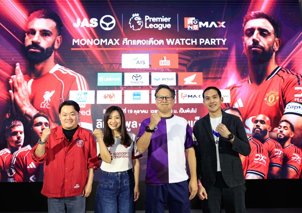 คุณนวมินทร์ ประสพเนตร ประธานเจ้าหน้าที่บริหาร บริษัท โมโน เน็กซ์ จำกัด (มหาชน) หรือ MONO , คุณวรพรรณ จันทร์เพ็ญ ประธานเจ้าหน้าที่การเงิน บริษัท จัสมิน อินเตอร์เนชั่นแนล จำกัด (มหาชน) หรือ JAS ร่วมด้วยพันธมิตร คุณวิรุฬห์ ภัทรมนัสกุล Head of Sport Sponsorship บริษัท บุญรอดเทรดดิ้ง จำกัด และ คุณรตะ โพอุทัย Senior Marketing Executive บริษัทหลักทรัพย์ วีบูลล์ (ประเทศไทย) จำกัด ถ่ายภาพร่วมกันในงาน “MONOMAX ศึกแดงเดือด WATCH PARTY” เพื่อร่วมเชียร์ศึกหยุดโลก “ลิเวอร์พูล VS แมนเชสเตอร์ ยูไนเต็ด” กันอย่างคึกคักกับบรรยากาศสุดเดือดแบบเรียลไทม์บนจอใหญ่ ณ centralwOrld LIVE ชั้น 8 เซ็นทรัลเวิลด์ เมื่อวันก่อน