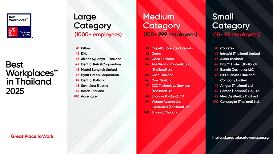 รายชื่อ Best Workplaces in Thailand 2025 ได้ยกย่ององค์กรที่โดดเด่นจำนวน 30 แห่ง จากสามประเภท ได้แก่ องค์กรขนาดใหญ่ (พนักงาน 1,000 คนขึ้นไป), องค์กรขนาดกลาง (พนักงาน 100-999 คน) และองค์กรขนาดเล็ก (พนักงาน 10-99 คน) ซึ่งองค์กรเหล่านี้ได้กำหนดมาตรฐานสำหรับการสร้างสรรค์สถานที่ทำงานที่มีพื้นฐานอยู่บนความไว้วางใจ, การทำงานร่วมกัน, และความใส่ใจ