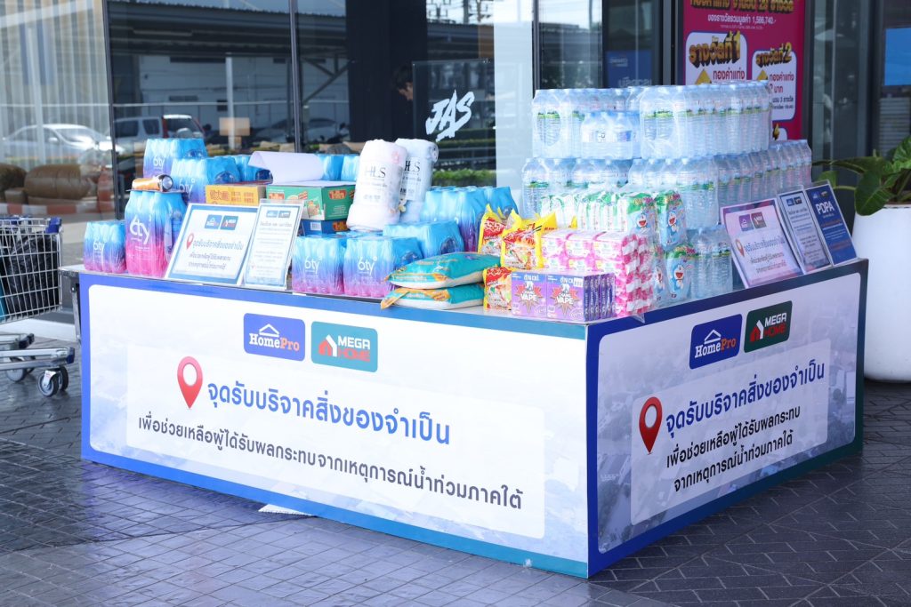 โฮมโปรและเมกาโฮม จะเปิดจุดรับบริจาคสิ่งของจำเป็นที่ โฮมโปรและเมกาโฮม ทุกสาขาทั่วประเทศ โดยตั้งจุดรับบริจาคหลักที่บริเวณพื้นที่หน้าสาขา ตั้งแต่เวลา 09.00 น. เป็นต้นไป เชิญชวนลูกค้าและประชาชนร่วมเป็นส่วนหนึ่งในการส่งต่อกำลังใจ ผ่านการบริจาคสิ่งของที่จำเป็นต่อการดำเนินชีวิตในช่วงวิกฤต อาทิ อาหารพร้อมทานหรืออาหารกระป๋อง บะหมี่กึ่งสำเร็จรูป ข้าวสาร อาหารแห้ง น้ำดื่ม ยารักษาโรค เสื้อผ้า ผ้าห่ม ผ้าเช็ดตัว เป็นต้น สิ่งของทั้งหมดนี้ จะถูกรวบรวมและจัดส่งไปยังพื้นที่ประสบอุทกภัยในภาคใต้ เพื่อให้ถึงมือผู้ที่ต้องการความช่วยเหลือโดยเร็วที่สุด