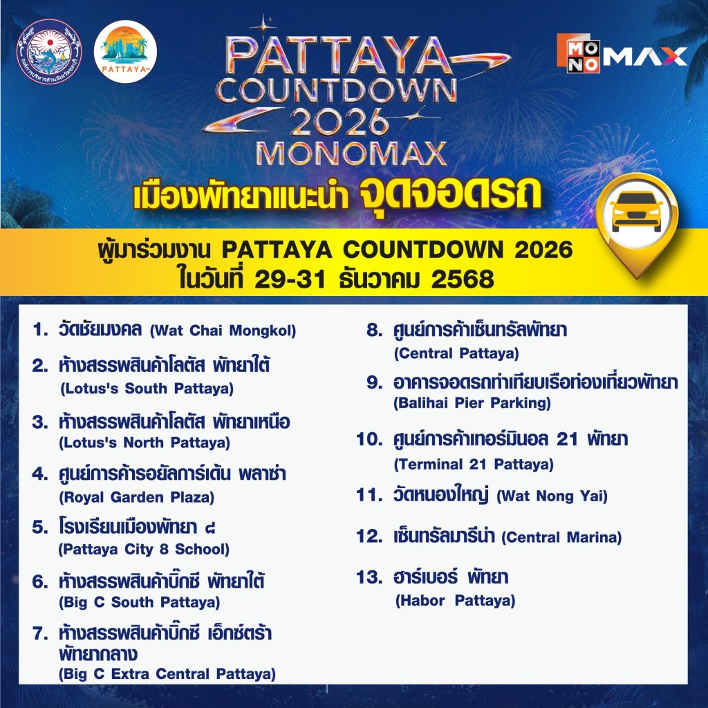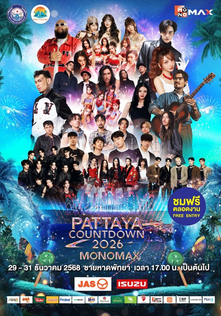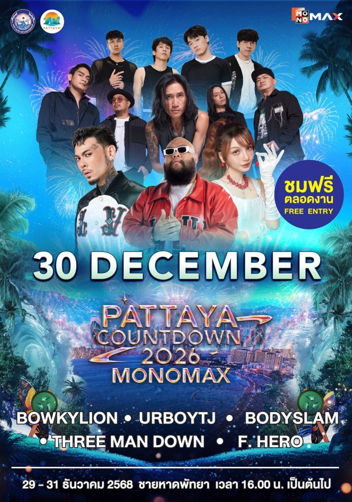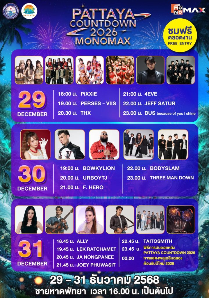 จากนั้นเข้าสู่ช่วงไฮไลต์หลักของเทศกาลกับงาน “PATTAYA COUNTDOWN 2026 MONOMAX” ซึ่งจัดขึ้นระหว่างวันที่ 29–31 ธันวาคม 2568 พบกับทัพศิลปินระดับท็อปที่ขนความสนุกมาแบบจัดเต็มตลอดทั้ง 3 วัน ก่อนสัมผัสไฮไลต์การแสดงแสงสีสุดตระการตา ปิดท้ายค่ำคืนส่งท้ายปีด้วยการแสดง พลุและโดรนกว่า 800 ลำ สร้างภาพจำสุดอลังการเหนืออ่าวพัทยา พร้อมโซนบูธอาหารเลิศรสและสินค้าจากเหล่าดารา คนดัง อาทิ จริยา, น้อย โพธิ์งาม, จุ๊บแจง วิมลพันธ์, หมอก้อง สรวิชญ์, อุ๊บ วิริยะ, F.HERO และอีกมากมาย ช่วยเพิ่มสีสันและเติมเต็มบรรยากาศให้เทศกาลปีนี้คึกคัก สนุกสนานตลอดทั้งงาน