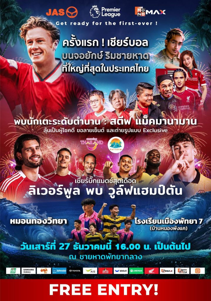 โดยเริ่มต้นอุ่นเครื่องความสนุกก่อนเข้าสู่ช่วงเคานต์ดาวน์ กับกิจกรรมพิเศษ “Watch Party on the Beach” ในวันเสาร์ที่ 27 ธันวาคม 2568 ตั้งแต่เวลา 16.00 น. เป็นต้นไป MONOMAX ชวนแฟนกีฬาและนักท่องเที่ยวมาสัมผัสประสบการณ์เชียร์ฟุตบอลบน จอยักษ์ริมทะเลยาวสุดสายตา ถ่ายทอดสดแมตช์เดือด ลิเวอร์พูล พบ วูล์ฟแฮมตัน พร้อมพบตำนานนักเตะ สตีฟ แม็คมานามาน แบบใกล้ชิด เสริมอรรถรสด้วยการพากย์สดโดย บอ.บู๋ × แจ็คกี้ รวมถึงความบันเทิงจาก โก๊ะตี๋–เสนาหอย–Candid Kibt–นิว การร่วมสร้างสีสันจากทีมเยาวชนเจ้าถิ่น ทีมหมอนทอง × พัทยา 7 และปิดท้ายความมันส์ด้วยคอนเสิร์ตจากแรปเปอร์หนุ่ม D.Gerrard โดยเปิดให้เข้าร่วมงาน ฟรีตลอดงาน เพียงลงทะเบียนผ่านแอปพลิเคชัน PEEP SHARE หรือคลิก https://open.peepshare.ai/Yxf0/pl-pattaya-2025