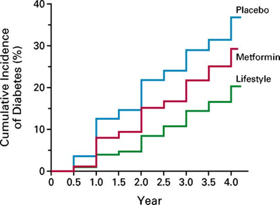 งานวิจัยที่ตีพิมพ์ใน National Library Health of Medicine แสดงให้เห็นว่า การออกกำลังกาย สม่ำเสมอช่วยลดความเสี่ยงการเกิดโรคเบาหวานชนิดที่ 2 อย่างมีนัยยะสำคัญ จากงานวิจัย และกราฟด้านล่าง แสดงการติดตามความเสี่ยงของการเกิดโรคเบาหวาน ของ คน 3 กลุ่ม ตลอดช่วงเวลาที่ติดตามผล พบว่า อัตราการเกิดโรคเบาหวานสะสม ในกลุ่มที่ทำโปรแกรมปรับพฤติกรรม (Lifestyle Intervention) เสี่ยงต่ำกว่ากลุ่ม ยาหลอก (Placebo) และต่ำกว่ากลุ่ม รับยารักษา (Metformin) ตามภาพ