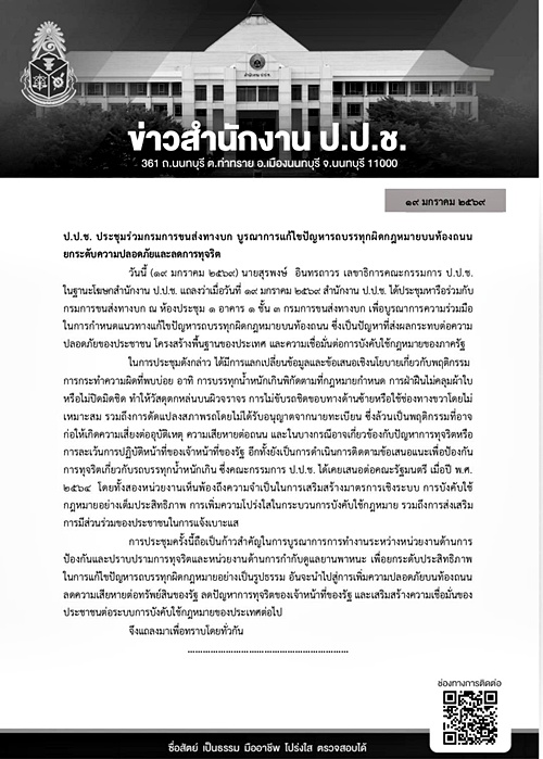 วันที่ 19 มกราคม 2569 นายสุรพงษ์ อินทรถาวร เลขาธิการคณะกรรมการ ป.ป.ช. ในฐานะโฆษกสำนักงาน ป.ป.ช. แถลงว่าเมื่อวันที่ 19 มกราคม 2569 สำนักงาน ป.ป.ช. ได้ประชุมหารือร่วมกับกรมการขนส่งทางบก ณ ห้องประชุม ๑ อาคาร ๑ ชั้น ๓ กรมการขนส่งทางบก เพื่อบูรณาการความร่วมมือในการกำหนดแนวทางแก้ไขปัญหารถบรรทุกผิดกฎหมายบนท้องถนน ซึ่งเป็นปัญหาที่ส่งผลกระทบต่อความปลอดภัยของประชาชน โครงสร้างพื้นฐานของประเทศ และความเชื่อมั่นต่อการบังคับใช้กฎหมายของภาครัฐ