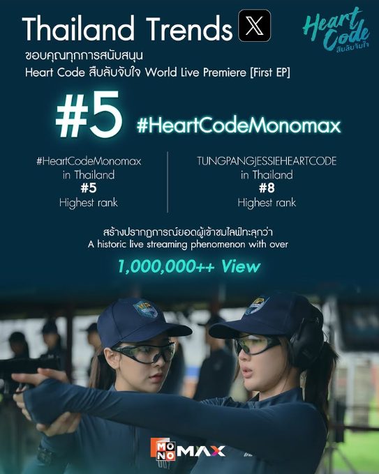 กระแสแรงอย่างต่อเนื่องสำหรับ Heart Code สืบลับจับใจ” ซีรีส์ GL แอ็กชั่น-ดราม่าสุดเข้มข้นเรื่องแรกจาก MONO Original ภายใต้การควบคุมการผลิตโดย บริษัท ดู เอ็นเตอร์เทนเม้นท์ จำกัด เรียกได้ว่าเคมีนี้ดีต่อใจที่สุดกับ 2 สาวสวยสุดร้อนแรง “ถุงแป้ง” ภัทรวดี เหลาสา และ “เจสซี่” ณัฐศิญา พรหมมาตร ควงคู่พาปัง! ทำถึงชนิดที่ว่าหลังจากสตรีมทาง MONOMAX ไปได้เพียง 3 ตอน ยอดการเข้าชมบนออนไลน์จนถึงปัจจุบันทะลุ 6 ล้านวิวไปแล้ว และขึ้นแท่นซีรีส์ยอดนิยมบนแอป MONOMAX หลังจากเริ่มสตรีมได้เพียง 2 สัปดาห์เท่านั้น! และในวันงานชมซีรีส์ตอนแรก Heart Code World Live Premiere [First EP] ก็ทำเอาแฮชแท็ก #HeartCodeMonomax ติดอันดับที่ 5 และคีย์เวิร์ด TUNGPANGJESSIE HEARTCODE ติดอันดับที่ 8 ใน Thailand Trends บนแอปพลิเคชัน X สร้างปรากฏการณ์ยอดผู้เข้าชมไลฟ์ ทะลุกว่า 1 ล้านวิวกันเลยทีเดียว!