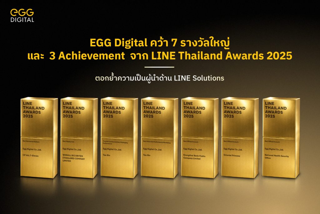 กรุงเทพฯ – “เอ้ก ดิจิทัล” (EGG Digital) ตอกย้ำบทบาทผู้นำด้าน MarTech และ Data บนแพลตฟอร์ม LINE ประกาศความสำเร็จพาแบรนด์พาร์ทเนอร์คว้า 7 รางวัลใหญ่ และ 3 รางวัล Achievement จากเวที LINE Thailand Awards 2025 ความสำเร็จครั้งนี้สะท้อนถึงความสามารถของ EGG Digital ในการยกระดับ LINE Ecosystem สู่เครื่องมือการตลาดดิจิทัลที่ทรงพลัง ชูจุดแข็งผสานพลัง Data, AI และ EGG ONE PLATFORM เข้ากับโซลูชันของ LINE เพื่อสร้างการสื่อสารและการตลาดแบบ Personalize Automation ครบวงจร ที่เชื่อมโยงทุกทัชพอยท์ของลูกค้าเข้ากับแบรนด์อย่างมีประสิทธิภาพ พร้อมยกระดับการมีส่วนร่วม และเปลี่ยนการสื่อสารให้กลายเป็นผลลัพธ์ทางธุรกิจที่วัดผลได้จริง