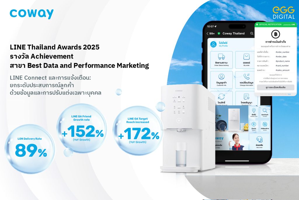 เอ้ก ดิจิทัล พลิกโฉม LINE Official Account ของ Coway Thailand ให้กลายเป็นศูนย์กลางบริการลูกค้า ผ่านแคมเปญ LINE Connect and Notification: Uplifting Customer Experience through Data and Personalization โดยเชื่อมต่อ LINE OA กับข้อมูลฐานลูกค้า Coway ที่มาจากช่องทางการขายผ่านตัวแทนจำหน่าย เว็บไซต์ และ Call Center โดยเชื่อมต่อ LINE OA กับข้อมูลฐานลูกค้า Coway ที่มาจากช่องทางการขายผ่านตัวแทนจำหน่าย เว็บไซต์ และ Call Center เพื่อให้บริการ Self-Service Chatbot สำหรับให้ข้อมูลเกี่ยวกับออเดอร์ สัญญา รอบชำระเงิน และรอบเข้าบริการหลังการขายได้ด้วยตนเองแบบเรียลไทม์ พร้อมทั้งแจ้งเตือนรอบชำระเงินรายเดือน, การแจ้งชำระเงินสำเร็จ และรอบเข้าบริการหลังการขายให้กับลูกค้า ผ่านระบบ LINE Official Notification ที่ส่งแจ้งเตือนผ่าน LINE ด้วยเบอร์โทรศัพท์ และสามารถสลับไปส่งทาง SMS ได้ตามช่องทางที่ลูกค้าเปิดรับ ทำให้การสื่อสารมีความแม่นยำ ครอบคลุมช่องทางที่ลูกค้าสะดวก และช่วยให้ลูกค้าใกล้ชิดกับแบรนด์มากยิ่งขึ้น ซึ่งผลลัพธ์ช่วยเพิ่ม LON Delivery Rate สูงขึ้นถึง 89%, LINE OA Friend Growth เติบโต 152%, LINE OA Target Reach เพิ่มขึ้น 172% และลดอัตราการ Block ลดลงจาก 13% เป็น 8%