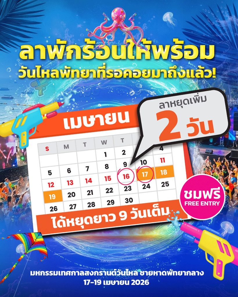 “พัทยา สงกรานต์ วันไหล 2026” จึงไม่ใช่แค่งานเล่นน้ำสงกรานต์ที่ธรรมดา แต่คือมหกรรมความสุขริมทะเลที่รวมทุกความสนุก ความมันส์ และเสน่ห์ของวัฒนธรรมไทยไว้ในที่เดียว พร้อมตอกย้ำภาพลักษณ์ของเมืองพัทยาในฐานะจุดหมายปลายทางแห่งเทศกาลระดับโลก ที่จะทำให้สงกรานต์ปีนี้ยิ่งใหญ่ สนุก และน่าจดจำที่สุด!! พบกับคอนเสิร์ตจากศิลปินดังตลอด 3 วันเต็ม และ T-POP สุดฮอตที่พร้อมระเบิดความมันส์แบบนันสต๊อป กับโปรดักชั่น แสง สี เสียง สุดอลังการ บนพื้นที่ชายหาดพัทยาเหนือจรดใต้