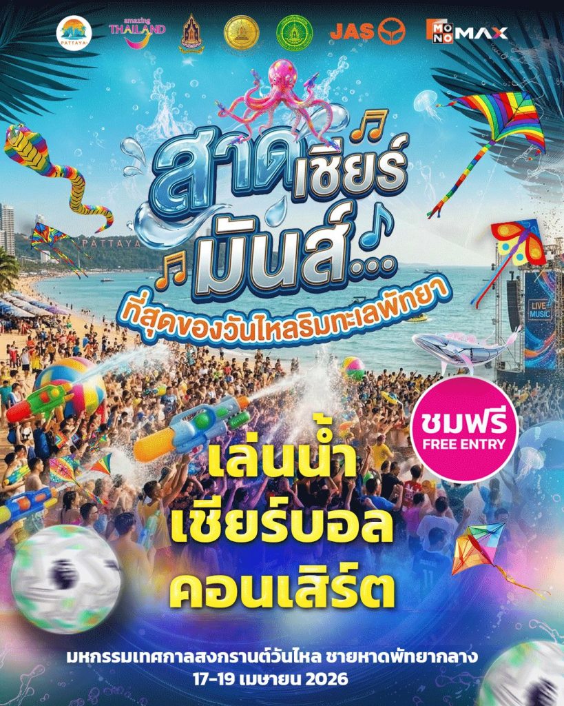 มาสนุกกันได้ในวันที่ 17–18-19 เมษายนนี้ เวลา 12.00–24.00 น. เข้าชมฟรีตลอดงาน พิเศษสุดวันที่ 19 เมษายน 2569 เตรียมพบกับประสบการณ์เชียร์บอลสุดเอ็กซ์คลูซีฟริมทะเล กับการถ่ายทอดสดศึก Premier League คู่เดือดระหว่าง Liverpool พบ Everton ถ่ายทอดสดจาก Hill Dickinson Stadium บนจอยักษ์ บอกเลยว่ามันส์ ใหญ่ สะใจ คอบอลห้ามพลาด!! ปักหมุดไว้….แล้วมาร่วมเป็นส่วนหนึ่งของปรากฏการณ์ “พัทยา สงกรานต์ วันไหล 2026” ที่เดือดสุดแห่งปี!!