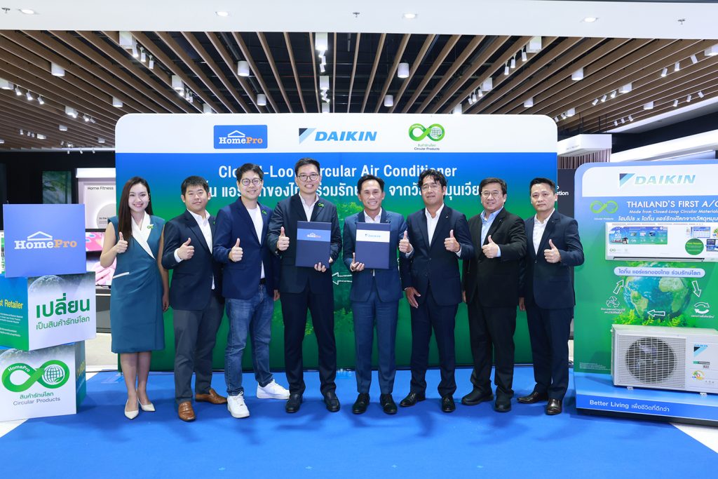 นายวรพงศ์ กียปัจจ์ กรรมการผู้จัดการ บริษัท สยามไดกิ้นเซลส์ จำกัด และ นายคาสุฮิสะ ฮินาสึ กรรมการบริษัท ไดกิ้น อินดัสทรีส์ (ประเทศไทย) จำกัด พร้อมด้วย นายอาเทพ พันธุ์อุทัยวัฒน์ ผู้ช่วยกรรมการผู้จัดการ บริษัท โฮม โปรดักส์ เซ็นเตอร์ จำกัด (มหาชน) เปิดตัว “เครื่องปรับอากาศรักษ์โลก” (Circular Air Conditioner) ครั้งแรกในประเทศไทย ภายใต้โมเดล Closed Loop Circular Product เปลี่ยนขยะจากโครงการ “แลกเก่าเพื่อโลกใหม่” ของโฮมโปร เป็นผลิตภัณฑ์เพื่อการอยู่อาศัยที่ยั่งยืนในชีวิตประจำวันของผู้บริโภค พร้อมวางจำหน่ายผ่านทุกช่องทางของโฮมโปรทั่วประเทศ สะท้อนบทบาทสององค์กรในการขับเคลื่อนนวัตกรรมที่ตอบโจทย์ประสิทธิภาพการใช้งานและความรับผิดชอบต่อสิ่งแวดล้อมไปพร้อมกัน โดยมี นายอนิรุทธ์ จินดาดำรงวนิช , นายณพล ก่อก้องวิศรุต นางสาวจริญญา ศรีประยูร ร่วมงาน ณ โฮมโปร สาขารังสิต
