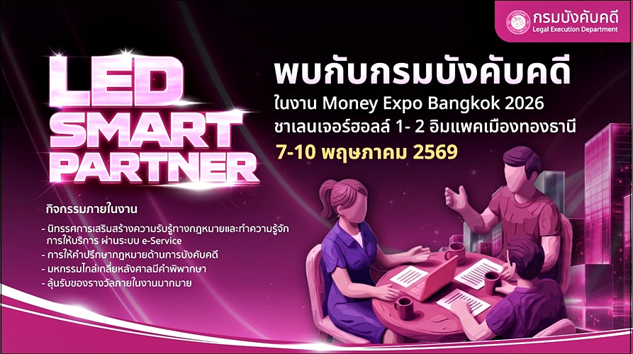 กรุงเทพฯ – กรมบังคับคดี กระทรวงยุติธรรม ประกาศความพร้อมเข้าร่วมงานมหกรรมทางการเงินครั้งยิ่งใหญ่ “Money Expo 2026” ภายใต้คอนเซปต์ “LED Smart Partner” มุ่งเน้นการเป็นคู่คิดอัจฉริยะที่ช่วยเปลี่ยนเรื่องหนี้ที่ซับซ้อนให้กลายเป็นเรื่องง่าย พร้อมมอบโอกาสการเริ่มต้นใหม่ทางการเงินให้กับประชาชน