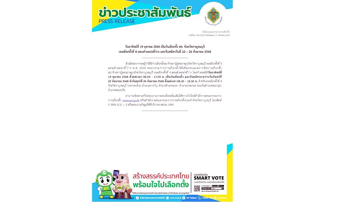 วันอาทิตย์ที่ 19 ตุลาคม 2568 เป็นวันเลือกตั้ง สส. จังหวัดกาญจนบุรีเขตเลือกตั้งที่ 4 แทนตำแหน่งที่ว่าง และรับสมัครวันที่ 22 – 26 กันยายน 2568 ด้วยมีพระราชกฤษฎีกาให้มีการเลือกตั้งสมาชิกสภาผู้แทนราษฎรจังหวัดกาญจนบุรี เขตเลือกตั้งที่ 4 แทนตำแหน่งที่ว่าง พ.ศ. 2568 คณะกรรมการการเลือกตั้ .. 16 ก.ย. 2025