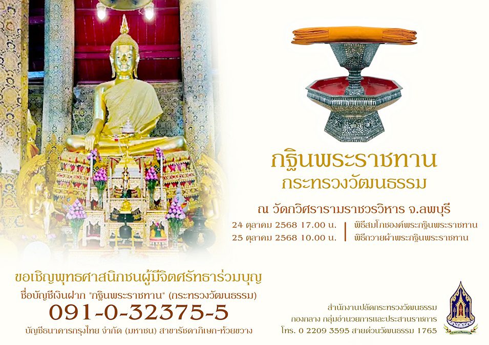 กระทรวงวัฒนธรรม ขอเชิญร่วมถวายผ้าพระกฐินพระราชทาน ประจำปี 2568 ณ วัดกวิศรารามราชวรวิหาร ลพบุรี 24-25 ตุลาคมนี้ เพื่อน้อมเกล้าน้อมกระหม่อมถวายเป็นพระราชกุศล แด่พระบาทสมเด็จพระเจ้าอยู่หัว สมเด็จพระนางเจ้าฯ พระบรมราชินี และพระบรมวงศานุวงศ์ทุกพระองค์ และ .. 16 ก.ย. 2025