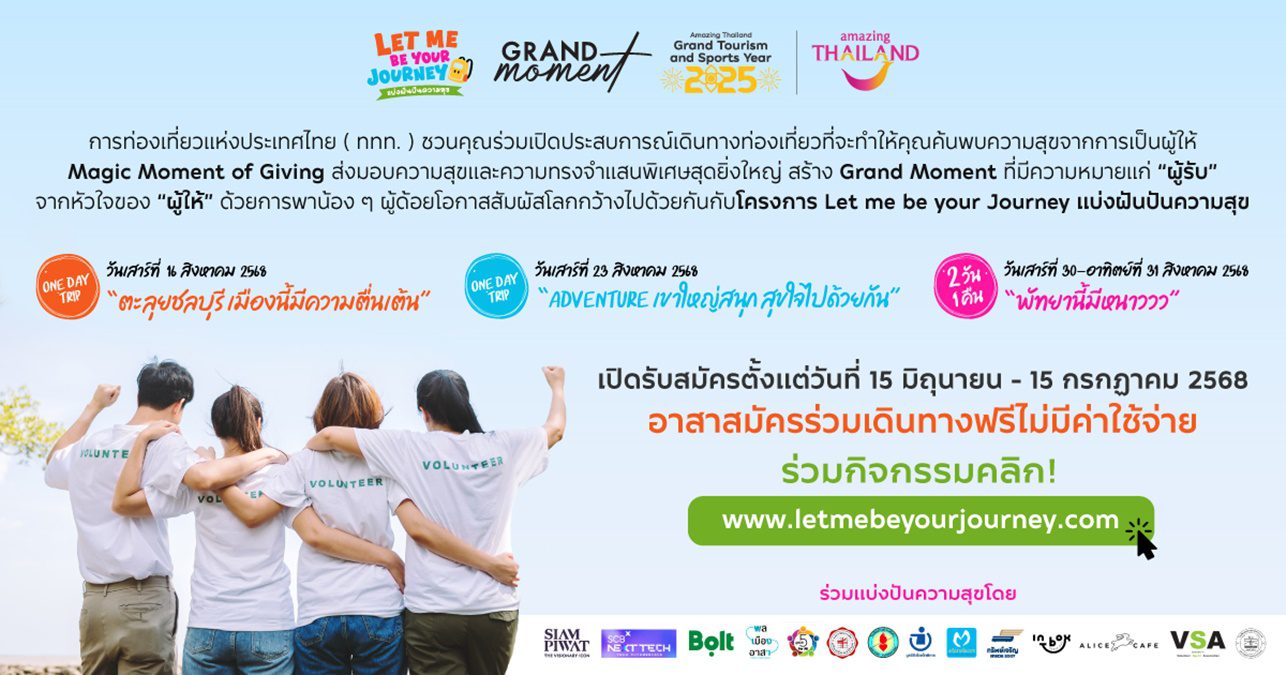ททท. เปิดรับอาสาสมัครคนรุ่นใหม่ ร่วมสร้างโมเมนต์แห่งการให้ผ่านโครงการ Let Me Be Your Journey แบ่งปันความสุขพาเด็กด้อยโอกาสเปิดประสบการณ์ท่องเที่ยว 3 เส้นทาง พัทยา-ชลบุรี-เขาใหญ่ การท่องเที่ยวแห่งประเทศไทย (ททท.) ต่อยอด Grand Moment ขับเคลื่อนปีแห่งการท่องเที่ยวไทย Amazing Thailand Grand Tourism & Sport Year 2025 .. 19 มิ.ย. 2025