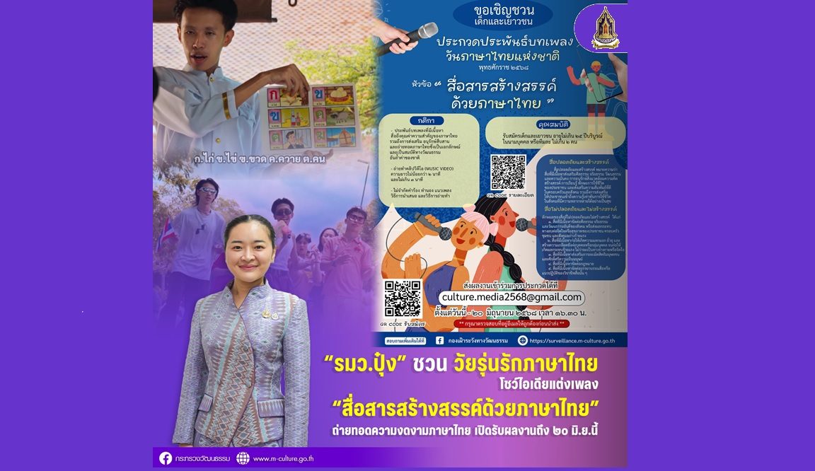 “รมว.ปุ๋ง” ชวนวัยรุ่นรักภาษาไทย โชว์ไอเดียแต่งเพลง “สื่อสารสร้างสรรค์ด้วยภาษาไทย” หนุนผลิตสื่อปลอดภัยและสร้างสรรค์สู่สังคม เปิดรับผลงานถึง 20 มิ.ย.นี้ นางสาวสุดาวรรณ หวังศุภกิจโกศล รัฐมนตรีว่าการกระทรวงวัฒนธรรม (วธ.) เปิดเผยว่า เนื่องในวันที่ 29 กรกฎาคมของทุกปีเป็นวันภาษาไทยแห่งชาติ เพื่อให .. 18 พ.ค. 2025