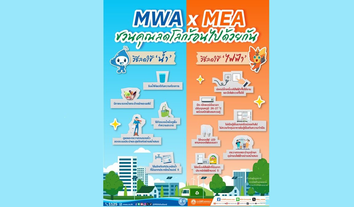 MWA X MEA ชวนคุณลดโลกร้อนไปด้วยกัน MWA หรือ การประปานครหลวง ร่วมกับ MEA หรือ การไฟฟ้านครหลวง ในฐานะหน่วยงานรัฐวิสาหกิจสังกัดกระทรวงมหาดไทย มีหน้าที่ดูแลระบบความมั่นคงระบบประปา .. 24 ก.พ. 2025