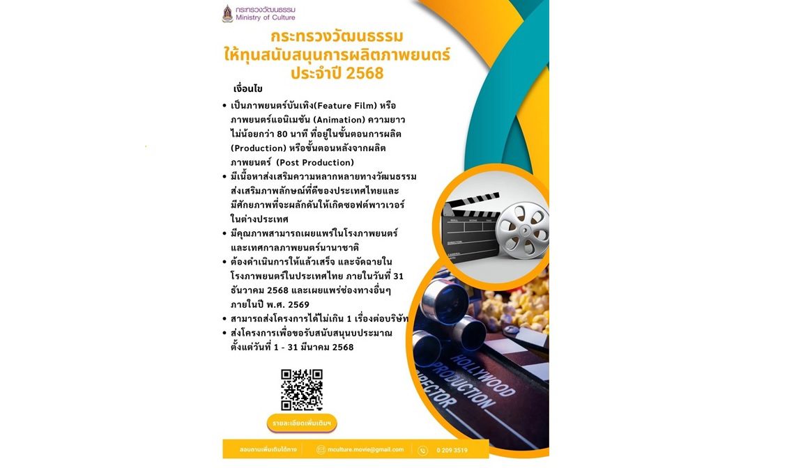 “รมว.สุดาวรรณ“ เดินหน้าผลักดัน Soft Power สร้างเสน่ห์วิถีไทย ครองใจคนทั้งโลกเชิญชวนผู้ประกอบการภาพยนตร์-แอนิเมชัน ยื่นรับทุนหนุนสร้างภาพยนตร์ เพื่อส่งเสริมซอฟต์พาวเวอร์ไทย ปี 2568 ตั้งแต่ 1-31 มี.ค.นี้ เปิดเวทีชี้แจงเกณฑ์รับงบหนุน 28 ก.พ.นี้ ณ กระทรวงวัฒนธรรม นางสาวสุดาวรรณ หวังศุภ .. 25 ก.พ. 2025