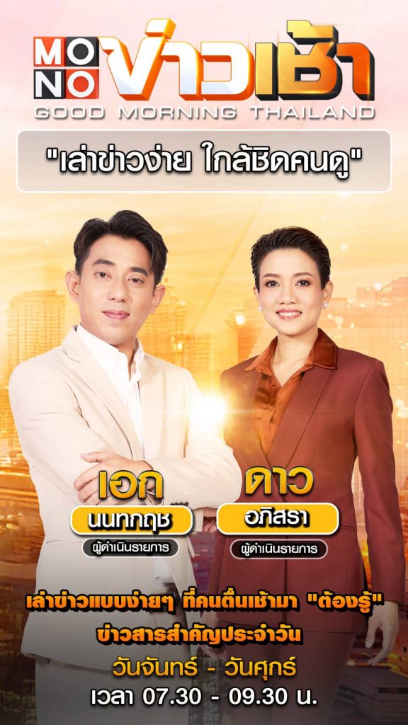 MONO29 เปิดศักราชใหม่ด้วยการดึง “ดาว-อภิสรา เกิดชูชื่น” มาประจำการในรายการ MONOข่าวเช้า คู่กับ “เอก นนทกฤช” รับชมได้ทุกวันจันทร์ – วันศุกร์ ตั้งแต่เวลา 07.30 – 09.30 น. ทางช่อง MONO29