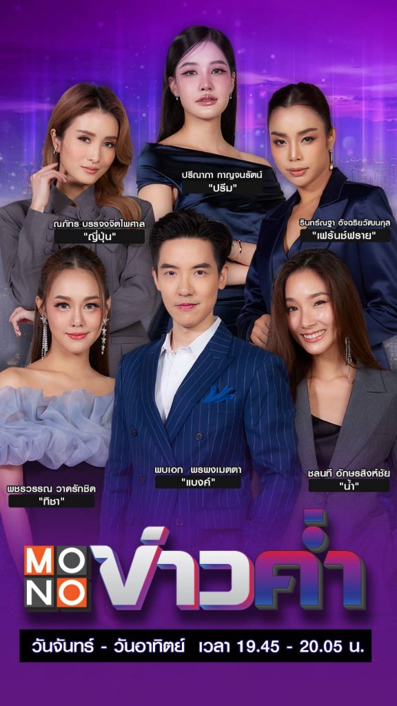 ไม่ตกข่าวร้อน ประเด็นที่สังคมกำลังติดตามและตั้งคำถาม ล้วงลึกคนดังวงการบันเทิงแบบ Exclusive สรุปข่าวเด่น ข่าวใหญ่หน้าหนึ่งของวัน ชัดเจนแบบฟันธง ตลอด 7 วัน กับรายการ “MONO ข่าวค่ำ” ตั้งแต่เวลา 19.45 – 20.05 น. โดยผู้ประกาศข่าว แบงค์-พบเอก พรพงเมตตา, ทิชา-พชรวรรณ วาดรักชิต , น้ำ-ชลนที อักษรสิงห์ชัย , ญี่ปุ่น-ณภัทร บรรจงจิตไพศาล และ เฟร้นช์ฟราย-รินทร์ณฐา อัจริยวัฒนกุล แท็คทีมสรุปข่าวเด่นที่เป็นข่าวหน้าหนึ่งในวันถัดไป อย่างกระชับตรงประเด็นในทุกแวดวง เสิร์ฟข่าวทุกช่วงเวลาอย่างเต็มอิ่มเข้มข้นไม่ตกกระแสแน่นอน
